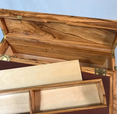 Meant to contain everything needed to correspond on the road, this hinged and handled box converts to an angled writing desk when the brass catches are released. Drawers provide storage for paper and pens, and the desk conceals multiple secret compartments.