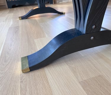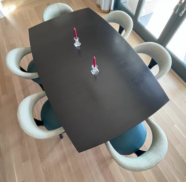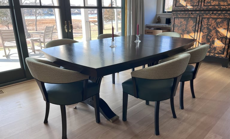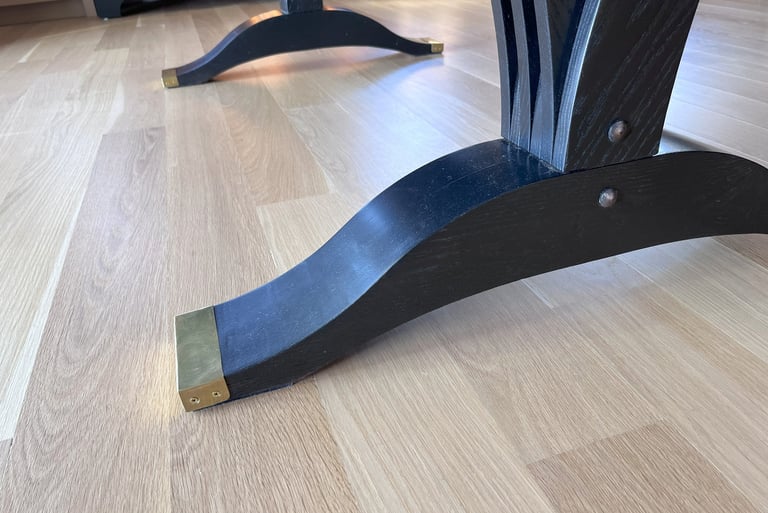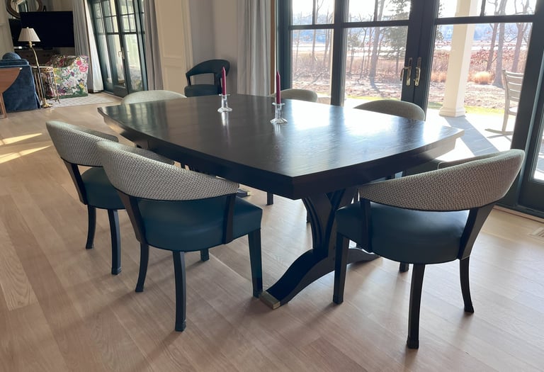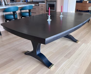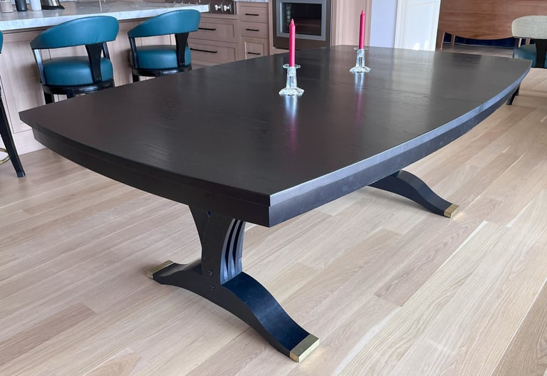 This dining table was designed for a large family that enjoys hosting gatherings of varied sizes. Constructed from white oak, and finished in jet black, this table has convex curved sides. These provide a gentle curve to the seating arrangements, allowing each diner the ability to see and interact with everyone else there. The table is supported by dramatic flared pedestals which anchor the heavy table top to the floor, while providing ample room for knees and feet.